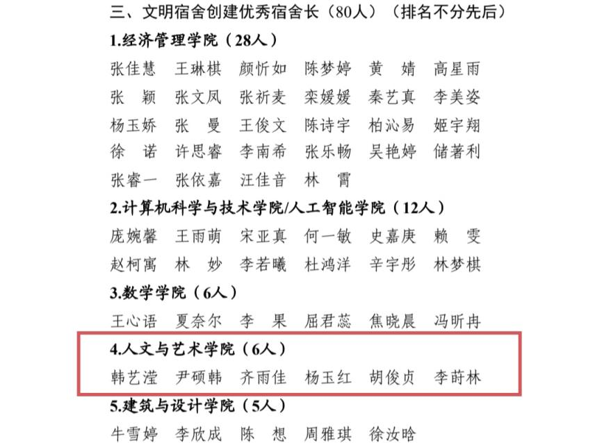 一直以来,学院高度重视学生文明宿舍的创建工作,通过党员宿舍挂牌、组织安全与文明素养主题宣讲、建立辅导员常态化走访机制、搭建宿舍长联动管理体系等举措,加强宿舍文化建设,将宿舍作为立德树人的重要阵地,以文化浸润涵育学生品格,以制度规范夯实成长根基。学院将以此次表彰为契机,发挥优秀榜样的传帮带作用,激发同学们创建文明宿舍的积极性与主动性,进一步优化管理服务机制,持续打造整洁有序、友爱互助、积极向上的宿舍育人环境,助力人文学子成长成才。