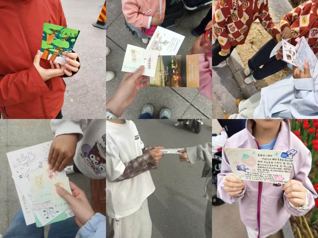 活动期间,报名参加的志愿者共分为两组,先后有序地开展工作。一组志愿者负责制作明信片,在卡片上执笔绘出精美的图案,用心写下文明观校的提示或是对小朋友的温暖寄语;另一组志愿者则将制作完成的明信片分发给入校参观的小朋友们,与他们聊天互动,在交流中传递善意,引导小朋友们文明观校,展现了球盟会