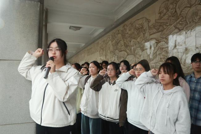 随后由沈思彤同学领誓,全体团员面向团旗,高举右拳,重温入团誓词。每一句都承载着团员青年对党的忠诚、对团的热爱,以及为共产主义事业奋斗终身的初心使命。仪式最后,全体团员在淮海战役烈士纪念塔前合影,定格这份庄重与热血。