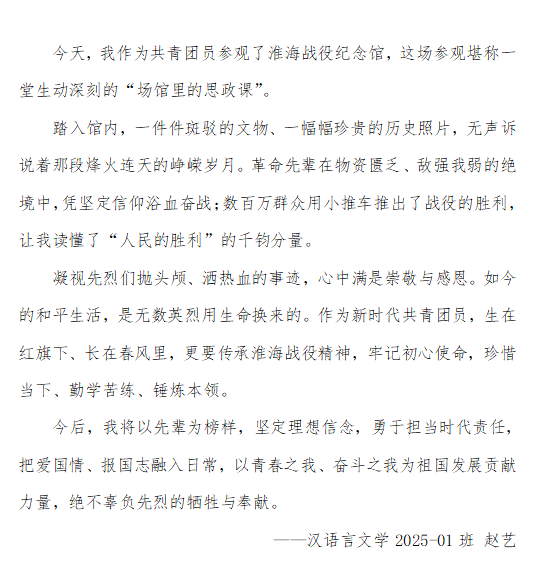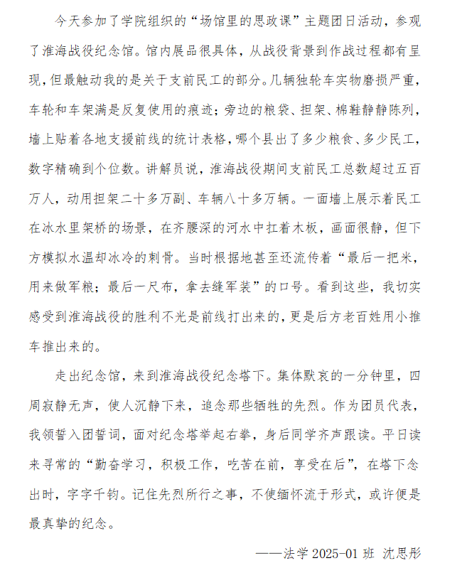 这场团日活动是一堂融情于景、入脑入心的“场馆里的思政课”,更是一次精神洗礼与思想升华。淮海战役的烽火虽已远去,英烈精神却穿越时空、历久弥新。通过沉浸式现场学习,团员青年们在红色场馆的深厚历史底蕴中进一步筑牢信仰之基、补足精神之钙。大家一致表示,要以这堂思政课为动力,传承红色基因、勇担时代使命,在强国建设、民族复兴的征程上贡献青春力量。
