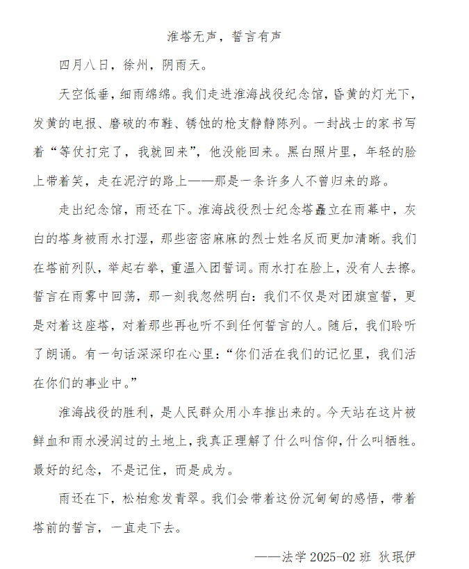 参观学习结束后,全体团员在烈士纪念塔前举行团日活动。阴思晗、冯梓豪、周子力三位团员代表以朗诵献上青春献词。他们从淮海大地的红色记忆讲起,追忆小推车支前、十人桥等动人故事,缅怀同龄英烈的无悔抉择,抒发新时代青年传承红色血脉、勇担时代使命的坚定决心。